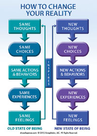 Met andere woorden, je denken heeft gevolgen voor je keuzes. Die keuzes hebben gevolgen voor hoe je handelt. De manier waarop je handelt beïnvloed je ervaringen. Die ervaringen zorgen voor emoties en die emoties roepen nieuwe gedachten op. Het is als een vicieuze cirkel, waarbij je één van dingen kunt veranderen waardoor alle andere dingen ook kunnen veranderen.